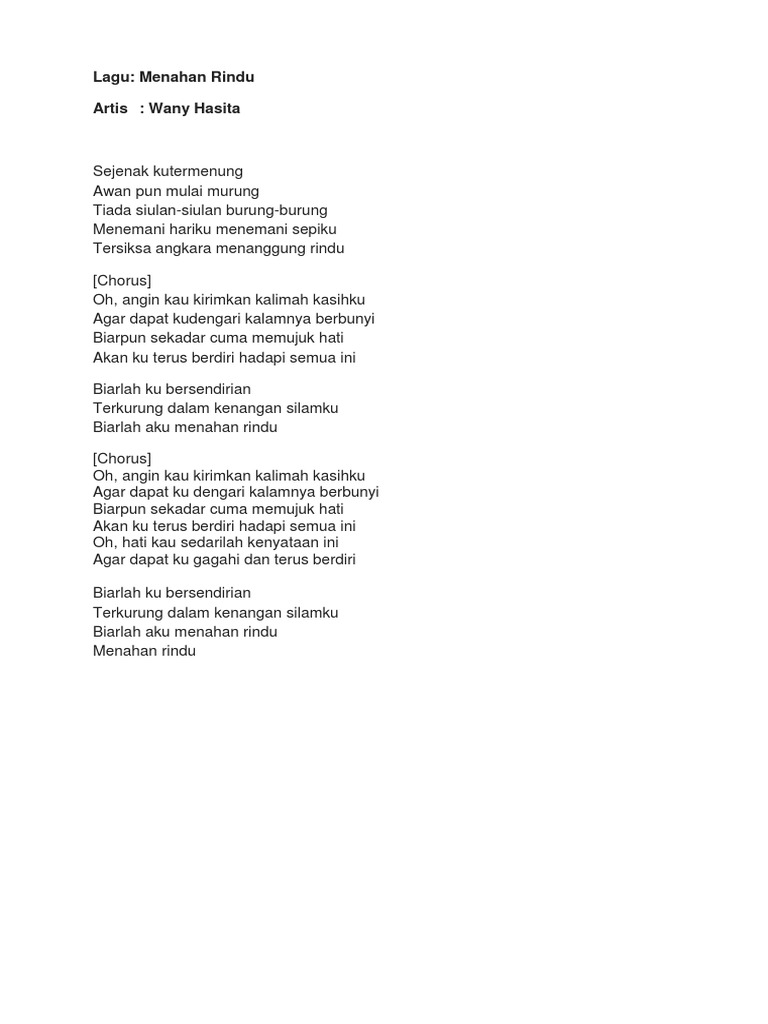 Oh angin kau kirimkan kalimah kasihku lirik. Biarlah ku bersendirian terkurung dalam kenangan silamku biarlah aku menahan rindu menahan rindu. Biarlahku bersendirian terkurung dalam kenangan silamku biarlah aku menahan rindu menahan rindu. Lagu top masa kini jgn lupa dengar yah. Oh angin kau kirimkan kalimah kasihku agar dapat ku dengari kalamnya berbunyi biarpun sekadar cuma memujuk hati akan ku terus berdiri hadapi semua ini oh hati kau sedarilah kenyataan ini agar dapat ku gagahi dan terus berdiri.